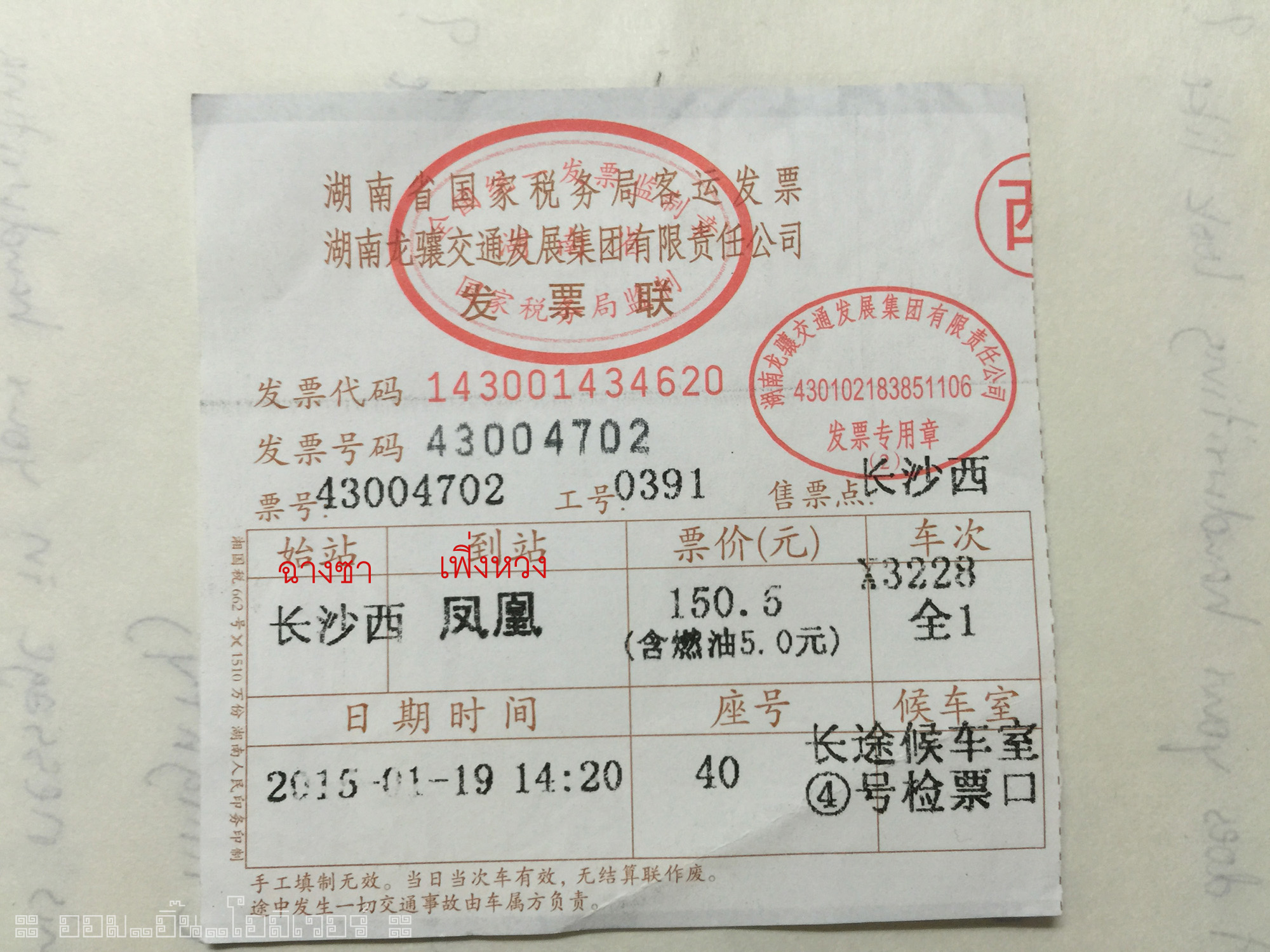 ขึ้นรถที่ประตู 4 ตรงจุดที่รอจะมีป้าๆ ถือป้ายสีแดงบอกจุดหมายปลายทาง พวกเธอที่ไม่รู้ภาษาจีน (เหมือนเราสามคน) ควรสังเกตตัวหนังสือชื่อเมืองด้วยเด้อจะได้ไม่เอ๋อ ทางออกเปิดเป็นช่องให้เข้าได้ทีละคน คาดว่ามีไว้กันพวกเนียนขึ้นรถฟรี อันนี้ให้อภัย พอถึงเวลาเดินทาง เราได้รับอนุญาตให้เข้าไปรอรถที่ชานชาลา (สักที) บริเวณรอรถเหมือนหมอชิตเปี๊ยบ รถไปเฟิ่งหวงของพวกเราสีฟ้าค่ะ นั่งตามเลขที่นั่ง แต่คนจีนที่มาด้วยกันแล้วไม่ได้ที่นั่งติดกันชอบมาขอเปลี่ยนที่ คนซวยคือโอลิเวอร์ 555 แต่นางฟินอยู่เพราะท้ายสุดนางได้นั่งข้างผู้ชายหน้าตาดีคนหนึ่ง 555