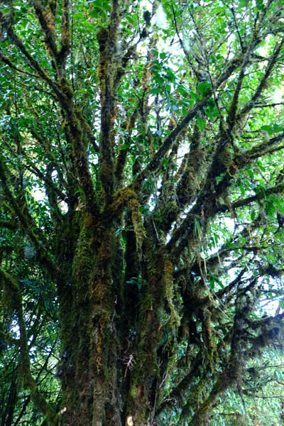 ทางเดินเต็มไปด้วยต้นไม้สองข้างทาง ต้นไม้ที่เต็มไปด้วยพืชจำพวกมอสปกคลุม หรือที่เรียกว่าต้นไม้ห่มผ้า