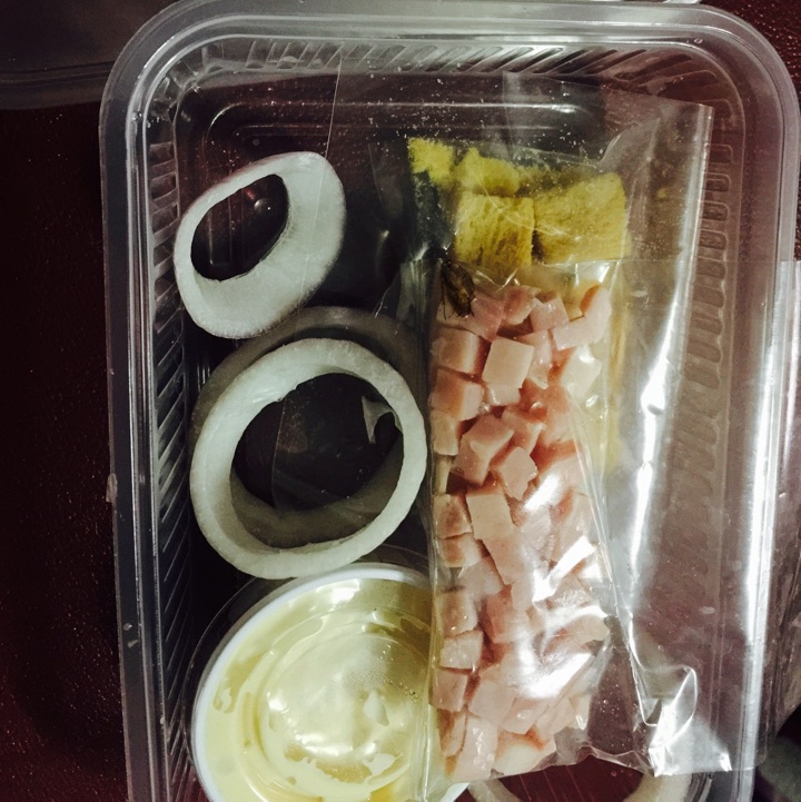 กำลังจะเอาแฮมเข้าปาก เห็นอะไรดำๆมีขา เลยเขี่ยดูให้แน่ใจ แมลงสาบจิ๋วจ้ะ