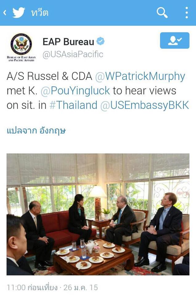 8.30 น. วันที่ 26 ม.ค. น.ส.ยิ่งลักษณ์ ชินวัตร อดีตนายกรัฐมนตรี พร้อมนายสุรพงษ์ โตวิจักษณ์ชัยกุล สุรนันทน์ เวชชาชีวะ เดินทางเข้าพบ นายแดเนียล รัสเซล ผู้แทนรัฐบาลสหรัฐฯ ประจำภูมิภาคเอเชียตะวันออก ที่บ้านพักเอกอัครราชทูตสหรัฐอเมริกาประจำประเทศไทย ถนนวิทยุ โดยใช้เวลา 30 นาที เพื่อสอบถามถึงสถานการณ์การเมืองปัจจุบัน ซึ่งล่าสุดมีการถอดถอน น.ส.ยิ่งลักษณ์ ในคดีรับจำนำข้าว