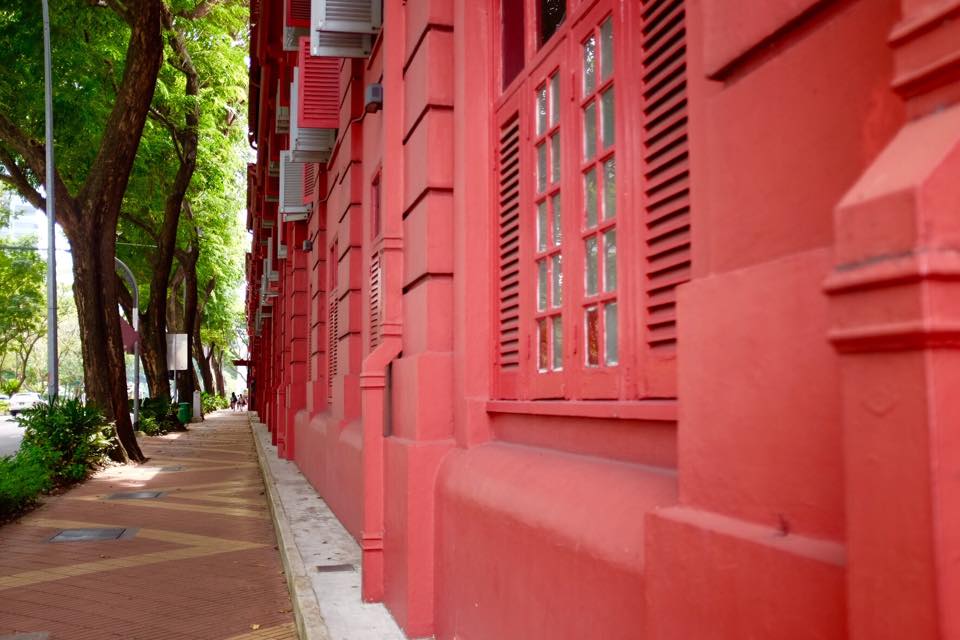 ออกจากสถานีรถไฟฟ้าใต้ดิน เดินประมาณ 500 เมตรเพื่อไปถ่ายรูปกับอาคารสีแดง Red Dot Design Museum
