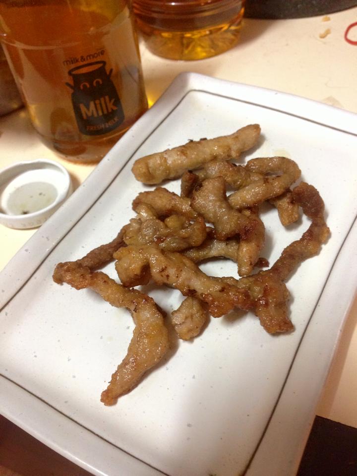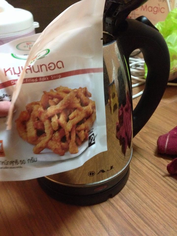 พอดีช่วงนี้เห็น 7-11 มีป้ายโฆษณาหมูเส้นทอด เราก็เลยไปลองมา 1 ถุง ปรากฎว่า อร่อยค่ะ รสชาติดีแต่แบบ เขาอุ่นในไมโครเวฟมันทำให้เรารู้สึกว่า โนวววววววว หมูทอดมันไม่ใช่แบบนี่สิมันแหยะๆ เหี่ยวๆงะ วันนี้เราเลยว่าจะซื้อมาทอดเองค่ะ แต่ก็แบบ ดึกแล้วงะ ขี้เกียจตั้งกระทะทอดทำไงดีน้อออออออออออ เหลือบไปเห็นกาต้มน้ำไฟฟ้าพอดี หุๆ เลยคิดว่า เอ๋? ถ้าเอาน้ำมันใส่ลงไปหละ ?จะเป็นไงน้อออ