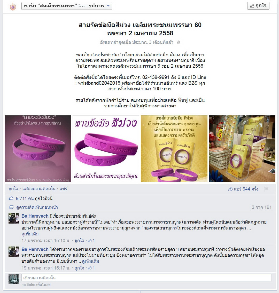 "ได้ทราบจากกองราชเลขานุการในพระองค์สมเด็จพระเทพรัตนราชสุดา ฯ สยามบรมราชกุมารี ว่าทางผู้ผลิตเคยทำเรื่องขอพระราชทานพระราชานุญาต แต่เรื่องไม่ผ่านที่ประชุม ซึ่งหมายความว่า ไม่ได้รับพระราชทานพระราชานุญาต ดังนั้นขอความกรุณาให้หยุดขายสินค้าของท่าน มิเช่นนั้นทางกองฯ จะต้องดำเนินการตามกฎหมายกับท่านและผู้เกี่ยวข้อง ในขณะนี้ได้แจ้ง ร้านนายอินทร์ ร้านหนังสือดอกหญ้า และเทสโก้ โลตัส ให้ตรวจสอบและดำเนินการกับท่านเรียบร้อยแล้ว จึงแจ้งมาเพื่อทราบและโปรดดำเนินการตามความเหมาะสมต่อไปจักขอบคุณยิ่ง"