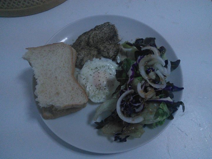 ส่วนจานนี้เอาไข่หนึ่งฟองไปตี ๆ แล้วเอาขนมปังมาชุบ เวฟ อีกฟองไปทำไข่ดาวน้ำ ไข่เหลือจากชุบขนมปังเอาไปเวฟ หั่นใส่ผักสลัด