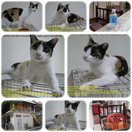 (for her safety) out of the Wat and with the permission of the Ketsaree Animal Hospital (Tel. 02 373 4712). We can give her shelter there for the moment.