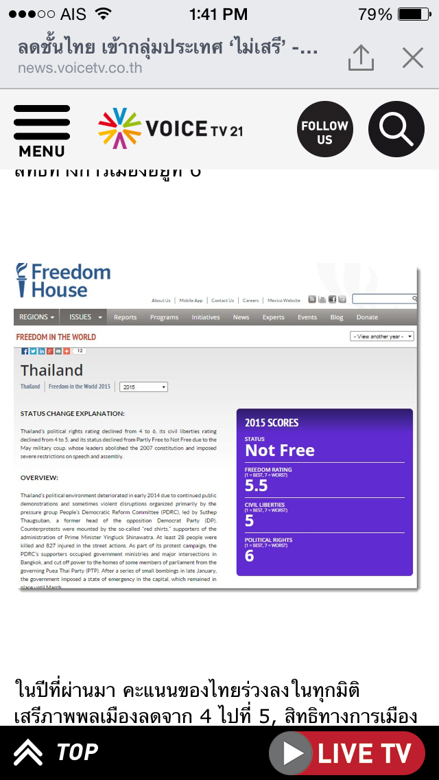 เปิดรายงานฟรีดอมเฮาส์ ‘เสรีภาพโลก 2015’ ลดชั้นไทยเทียบเท่าประเทศในแอฟริกา จัดเข้ากลุ่ม ‘ไม่เสรี’ เหตุเพราะกองทัพยึดอำนาจ ฉีกรัฐธรรมนูญ จำกัดเสรีภาพในการพูดและการชุมนุม