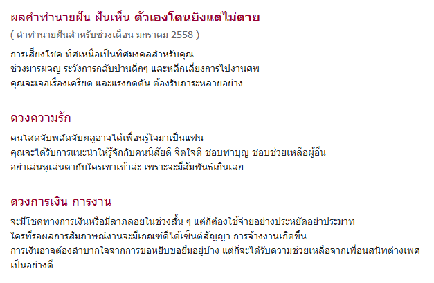 ตัวเองโดนยิงแต่ไม่ตาย ซึ่งตามตำราทำนายฝัน มีคำทำนายดังนี้ครับ