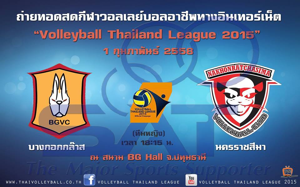 วอลเลย์บอลไทยแลนด์ลีก บางกอกกล๊าส - อยุธยา A.T.C.C เวลา 16 : 00 น. ณ สนาม BG Hall จังหวัดปทุมธานี 15 กุมภาพันธ์ 2558 ลิ้งค์ในการรับชมวอลเลย์บอลไทยแลนด์ลีกถ่ายทอดสดผ่านทางอินเตอร์เน็ตโดยการกีฬาแห่งปร