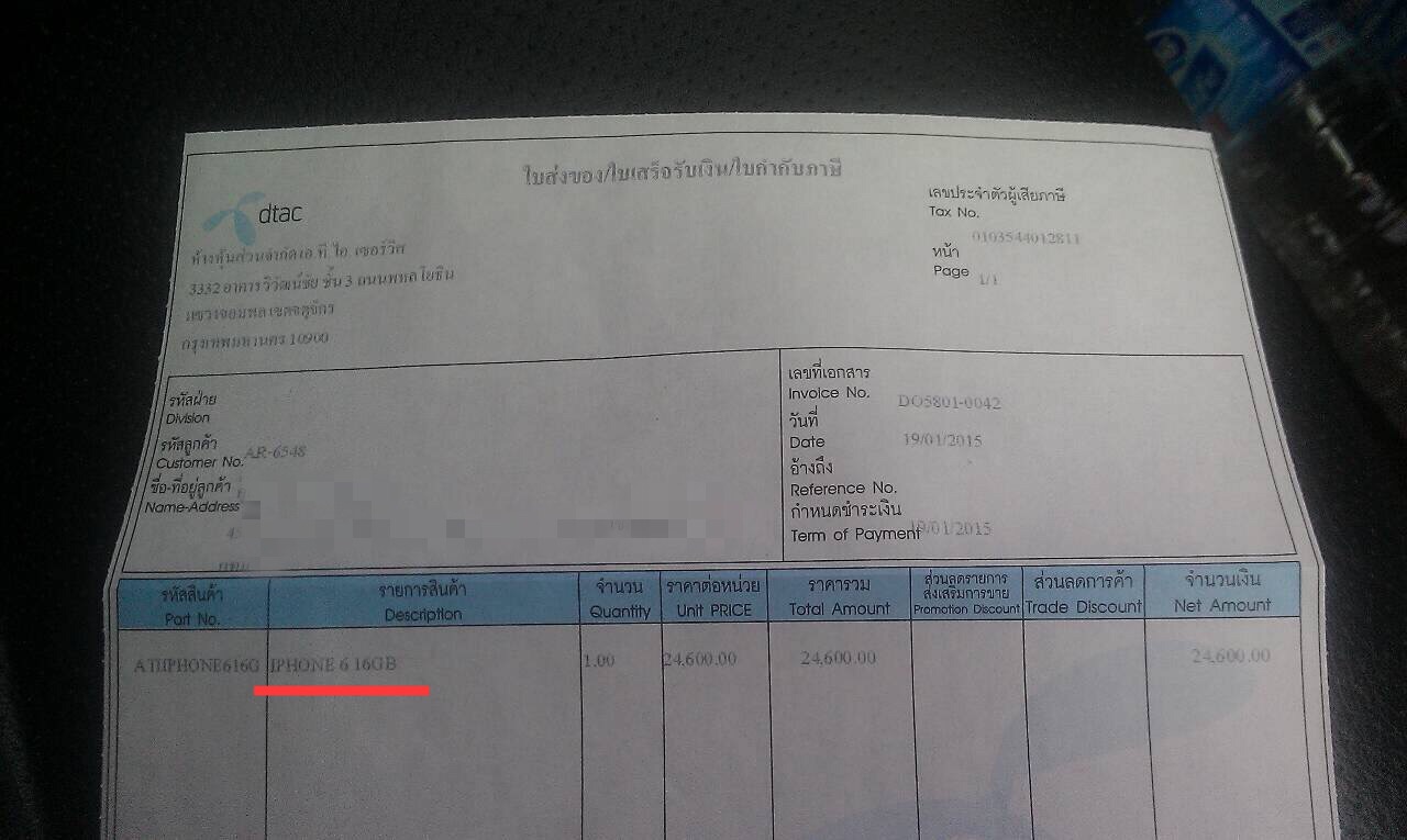ผมจึงสอบถามจากเพื่อนที่ซื้อเครื่องจากDTACเหมือนกัน(เพื่อนซื้อจากสยามพารากอน) ได้รับคำตอบว่ามีการระบุสี หมายเลขเครื่องและModelเครื่องเอาไว้ในใบเสร็จด้วย ผมจึงลองSearchจากWebsite Kaidee และ olx ที่มีประกาศขาย iPhone บางประกาศก็จะลงใบเสร็จไว้ มันก็มีระบุรายละเอียดเหมือนของเพื่อนที่ซื้อจากสยามพารากอน จึงได้ติดต่อไป DTAC1678