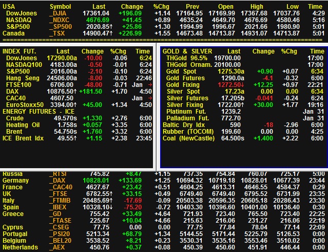 ตลาดหุ้นสหรัฐฯปิดการซื้อขายวันที่ 2 ม.ค. ในแดนบวก โดยดัชนีดาวโจนส์เพิ่มขึ้น 196.09% ปิดที่ 1.14% ปิดที่ 17361.04 จุด ส่วนดัชนีเอสแอนด์พี 500 เพิ่มขึ้น 25.86 จุด หรือ 25.86 จุด หรือ 1.30% ปิดที่ 2020.85 ขณะที่ดัชนีแนสแด็กเพิ่มขึ้น 41.45 จุด หรือ 0.89% ปิดที่ 4676.69 จุด