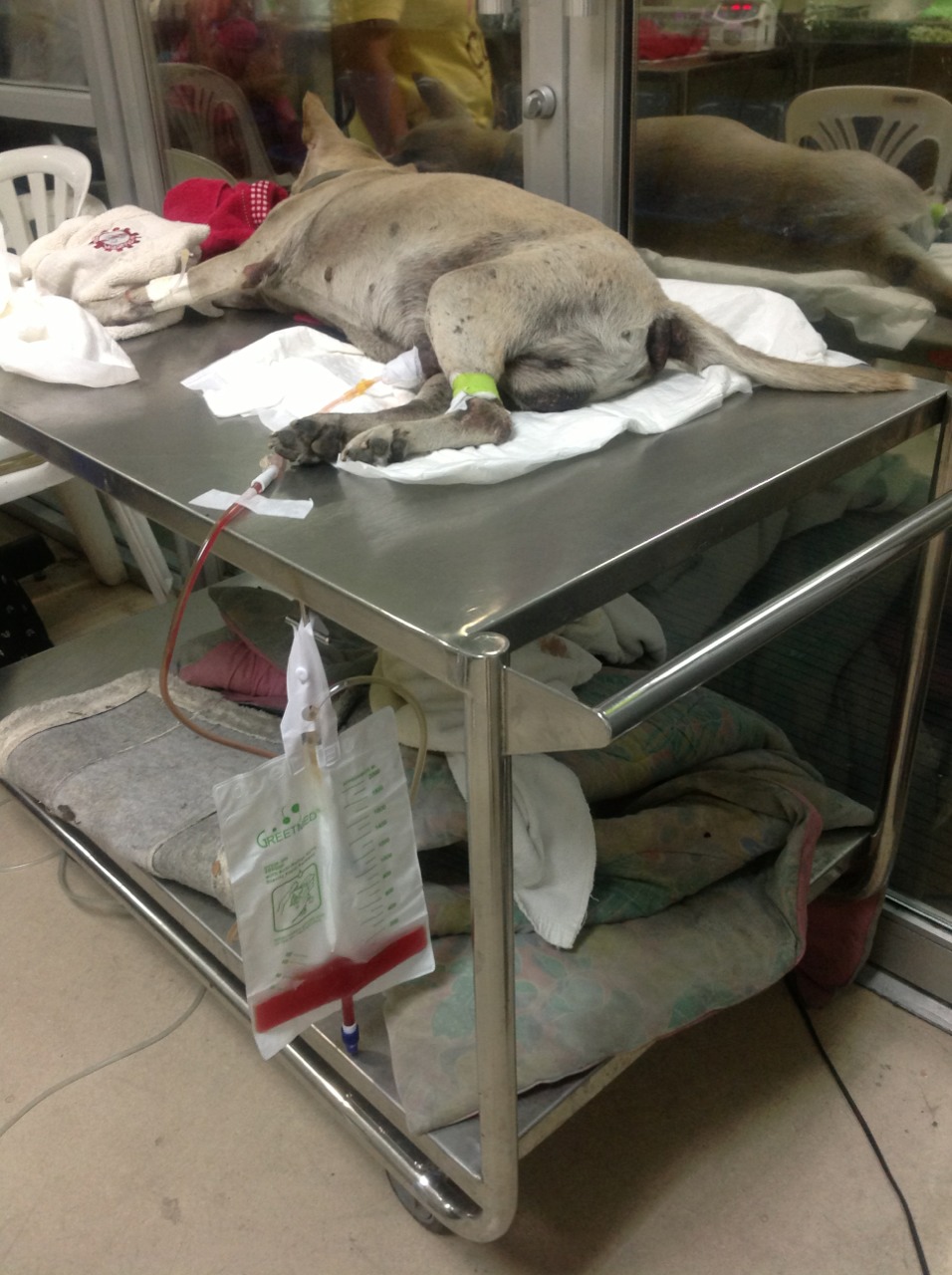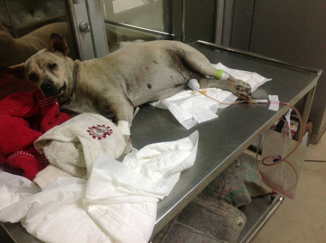 เข้ารักษามา 4 วันแล้วเนื่องจากถูกรถยนต์ทับที่ช่วงท้ายของลำตัวทำให้ ไม่สามารถลุกขึ้นเดินได้เลยต้องนอนหมอบอยู่กับพื้นตลอดเวลา กระเพาะปัสสาวะแตก และท่อปัสสาวะเป็นแผลลึกมาก ทำให้ปัสสาวะไม่สามารถขับออกมาได้จึงสั่งสมอยู่ในช่องท้องเกิดการติดเชื้อ ค่าไตสูงมากมีโอกาสเป็นไตวายได้เลย และกระดูกสะโพกกับขาก็หัก รวมถึงมีเลือดออกจากปอด อาการสาหัสมาก