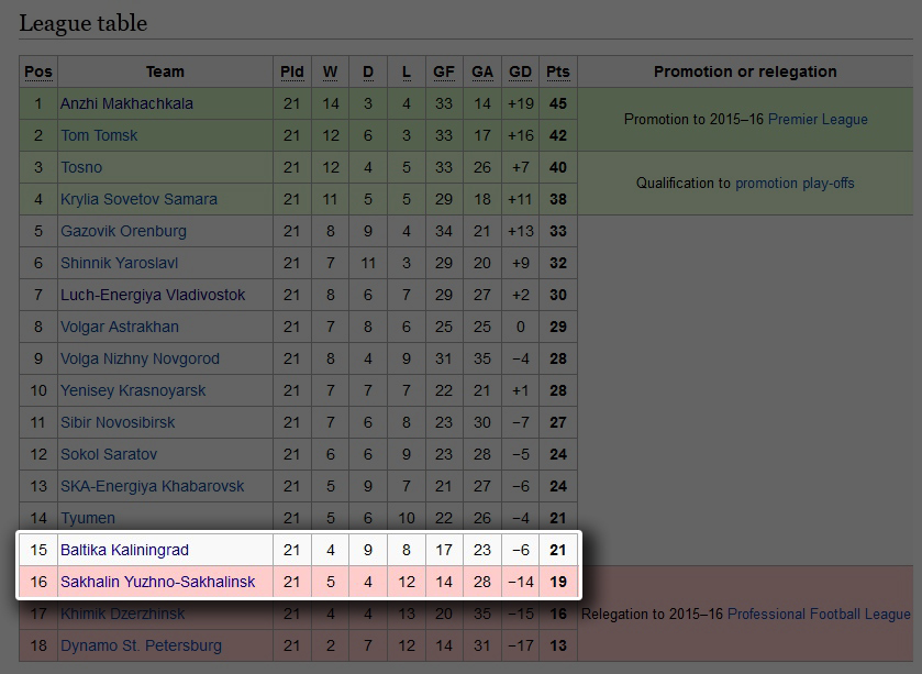 ทีมแรก FC Baltika Kaliningrad ตั้งอยู่ที่เมือง Kaliningrad ซึ่งจากรูปจะอยู่ที่จุดหมายทางซ้าย จะเห็นว่าเป็นแผ่นดินของรัสเซียในส่วนที่ไม่ได้ติดกับรัสเซีย แต่อยู่ไกลออกมาท่ามกลางประเทศโปแลนด์ เบลารุสและลิธัวเนีย ซึ่งเคยเล่นในลีกสูงสุดมาก่อนที่จะตกชั้นในปี 1998 จากนั้นก็วนเวียนอยู่ในลีกรองมาตลอด โดยมีตกชั้นลงไปดิวิชั่น2 เพียง 2 ครั้งเท่านั้น