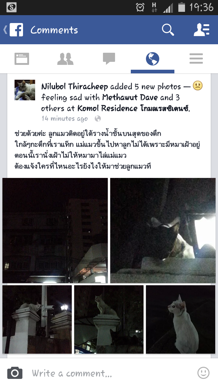 รายละเอียดตามภาพเลยนะคะ หน้าเฟสเราเอง ลูกแมวติดอยู่ใต้รางน้ำบนสุดของตึก แต่แม่แมวขึ้นไปหาลูกไม่ได้ มีหมาไล่อยู่ ตอนนี้เรานั่งเฝ้าไม่ให้หมาไล่แม่แมวอีกที เพื่อนให้เบอร์กลุ่มพิทักษ์สัตว์มา แต่โทรไปแล้วไม่มีคนรับเลย