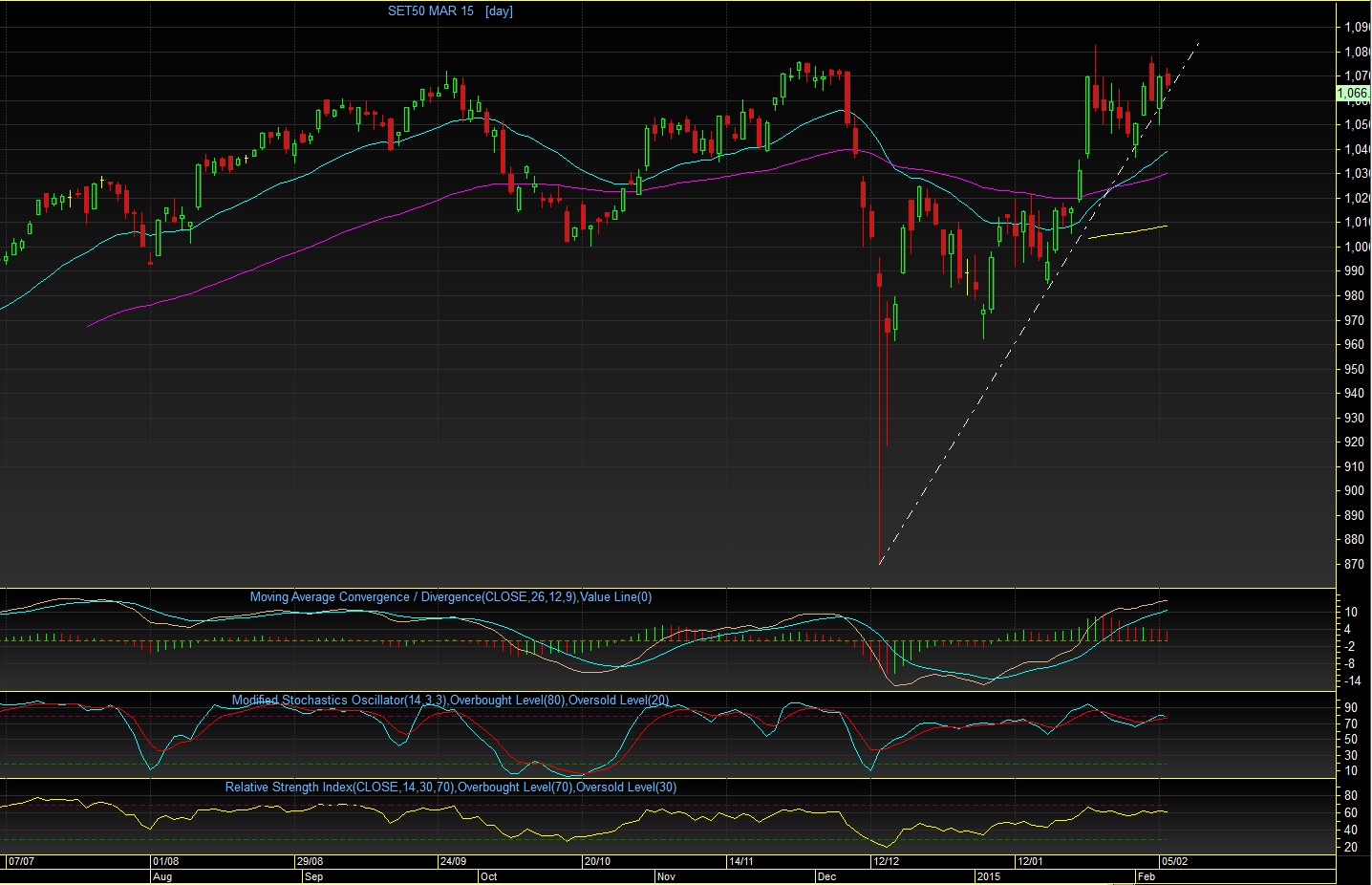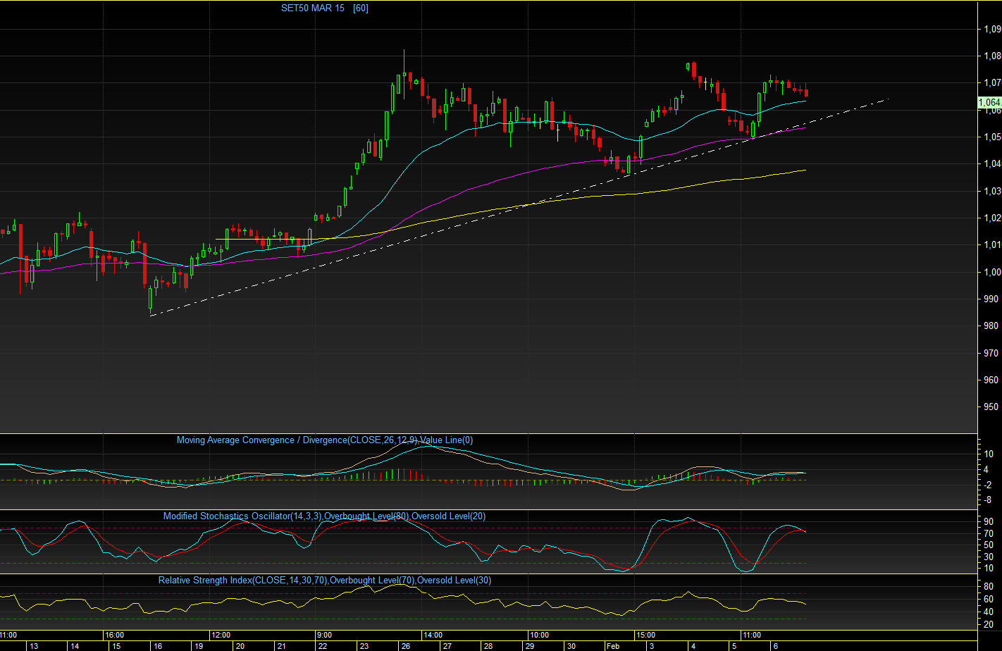 TF60 : ตลอดวันศุกร์ที่ผ่านมา ดัชนีค่อนข้างแกว่งตัวในกรอบแคบๆ (1064 - 1073 จุด) ลงมาเฉียดๆ EMA25 วัน