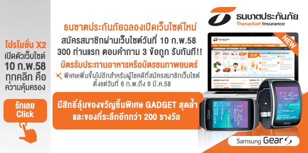 อย่าพลาดมาลงทะเบียน 10 กพ. 2015 นี้เท่านั้น แจกโชค X2 ลงทะเบียนและตอบคำถามให้ถูก 300 ท่านแรก เลือกรับของรางวัลไปเลยจ้า มูลค่า 300 บาท โชค 2 มาลุ้น Samsung Gear S สุดล้ำ ไปเลย ง่ายขนาดนี้ อย่าลืม อย่าพลาด บอกต่อกันด้วยน๊ะ เข้าใจตรงกันนะ OK http://www.thanachartinsurance.co.th/tnifrontend/articledetail.aspx?id=50