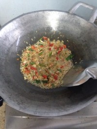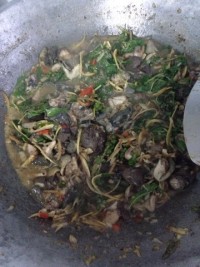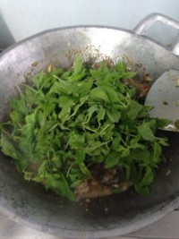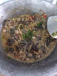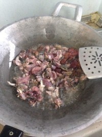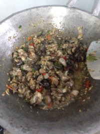 จากนั้นเราก็นำกบที่เราทอดแล้วมาใส่ผัดคลุกเครื่องแกงลงไป ขั้นตอนนี้ให้ใส่น้ำปลาลงไปครับ ขณะผัดเครื่องแกงจะติดกระทะบ้างครับ อย่าไปสนใจ