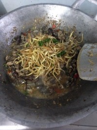 เมื่อเข้ากันดีแล้วให้ใส่น้ำลงไปครับ แค่นิดหน่อยพอนะครับ ถึงตอนนี้เครื่องแกงที่ติดกระทะก็ไม่ติดแล้วครับ ให้เราปรุงรสโดยใส่ซีอิ้วขาว น้ำมันหอยลงไปครับถ้าใครชอบหวานก็ส่น้ำตาลปีบลงไปนิดหน่อยครับ ชิมรสตามชอบครับ ถึงขั้นตอนนี้ถ้าใครจะทำผัดกระเพราก็ใส่กระเพราลงไปก็เสร็จแล้วครับ แต่ผมอยากทานผัดฉ่าเลย ใส่กระชายกับพริกไทยสดลงไปครับ