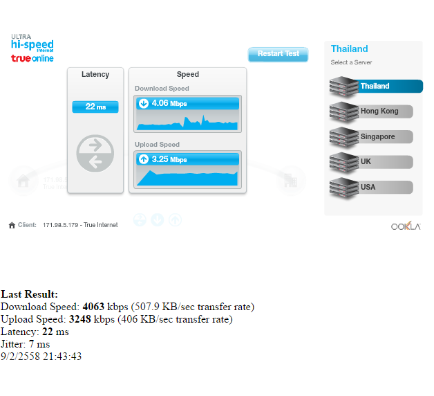 ผมเคยตั้งกระทู้ไปครั้งหนึ่งกับ การรีวิว อินเตอร์เน็ต ทรู กับความ เน่าสนิทของอินเตอร์เน็ตทรู ซึ่งช่างได้เข้ามาทำการแก้ไข อยู่ สองครั้ง ไม่ได้ช่วยทำให้ระบบหรือการใช้งานเป็นไป ตามที่ ตกลงแต่ อย่างใด ล่า สุด อาการของอินเตอร์เน็ตยังเหมือนเดิม คือ เน่าสนิท จาก 30 mb ที่ต้องการได้จากการจ่ายค่าบริการ 899 กลายเป็นสิ่งที่ จ่ายไปนั้น ไม่ได้ตามที่ตกลง ทาง cc ของ ทรูก็เพียงแค่รับเรื่อง ไม่ได้จิงจังต่อการแก้ไขปัญหาให้กับลูกค้า (ทั้ง Call Center และ CC บนพันทิพ ) อินเตอร์เน็ตมีปัญหา ทุกวัน ครับ พอตกดึกมีคนใช้งานจำนวนมาก เลยทำให้เน็ตช้า คือ นี้ไม่ช่ายข้ออ้างครับ ในสัญญาไม่ได้มีบอกไว้ว่า ถ้าคนใช้งาน เยอะ เน็ตจะไม่ได้ 30 mb ตามที่ตกลง ผมมีภาพประกอบด้านล่าง และ ผมอยากสอบถามถ้า จะยกเลิก โดยไม่ครบปีจะได้ไหม หรือ เขาผิดสัญญาการให้บริการก่อน หรือ ถ้าไม่ได้ เราจะฟ้องร้องความเสียหายที่ได้รับจากที่ไหน ปล. ผมเชื่อว่าลูกค้าหลายราย เป็นเหมือนกันผม ล่าสุด test Speed วันนี้มะกี้ test speed ไปยัง Server ของ กทม ซึ่งน่าจะได้ความเร็วที่มากแต่กลับ เป็นดังรูปครับ