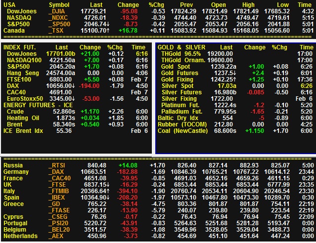 ด้านตลาดหุ้นสหรัฐฯเมื่อวันจันทร์(9ก.พ.) ปิดลบตามตลาดทุนอื่นๆทั่วยุโรป หลังมีความกังวลมากขึ้นเรื่อยๆว่ากรีซอาจผิดนัดชำระหนี้และต้องออกจากยูโรโซน