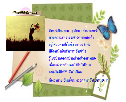 นำคำกลอนที่เคยแต่งมาต่อกันในวันพระและเป็นวันพฤหัสบดีครับ แปลกใจอยู่เหมือนกันนะทำไมเวลามองพระจันทร์มันทำให้คนส่วนใหญ่รู้สึกเดียวดายยังไงก็ไม่รู้ จันทร์ยามนี้ มิฉายแสง ดังแกล้งหมายดาราราย&n