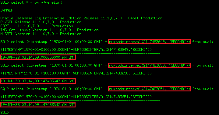 - และเมื่อลองต่อไปเรื่อยๆ ด้วย offset ที่มากกว่า 2,147,483,650 เวลาที่ oracle แสดงผลหยุดอยู่ที่ 19-JAN-38 03.14.09.147483647 AM GMT