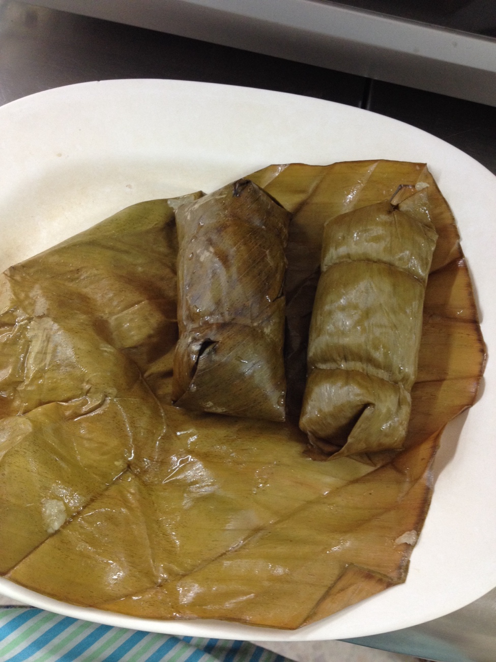 แกะอันแรกออกมา ข้าวเหนียวมันติดใบตองงะ ออกมาในสภาพไม่สวยงามเท่าไหร่