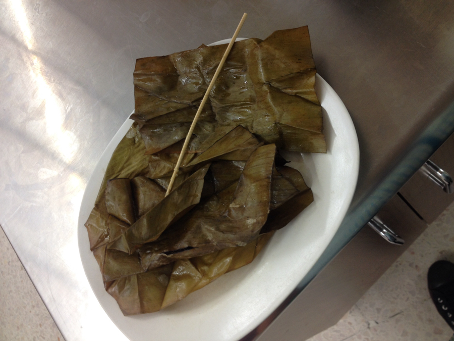 แกะออกมา เอ่อ..มีใบตองห่อด้วย เราคิดว่าแกะออกมาจะเป็นข้าวเลยนะเนี่ย. ดูจริงจังอ้ะ