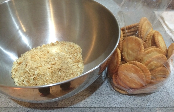 ✔ บดเครกเกอร์ที่เราเตรียมไว้ก่อนค่ะ หาอะไรมาทุบก็ได้ แต่บดละเอียดๆนะคะ