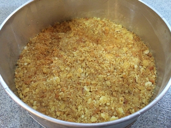 ✔ จากนั้นเอาเนยไปละลายแล้ว เอาเครกเกอร์บดตักใส่เข้าไปในฐานหรือถาดที่ต้องการ