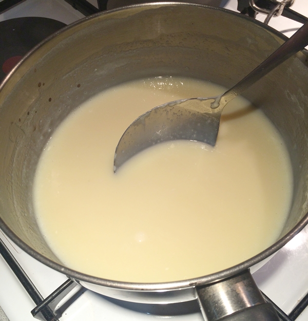 ✔ ก่อนอื่นเอานมไปต้มก่อน แล้วก็ใส่เจลาตินเข้าไปคนๆ ให้มันละลายเข้าด้วยกัน