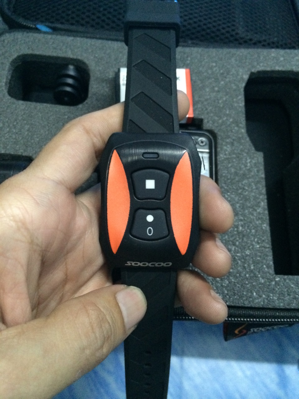 6. สายรัดข้อมือควบคุมครับ เชื่อมต่อรวดเร็วดี ใช้สำหรับกด ถ่ายรูปหรือวีดีโอ และสามารถเช็คสถานะตัวกล้องว่ากำลังทำอะไรอยู่จากการกระพริบของไฟบนสายรัดข้อมือได้ด้วยครับ