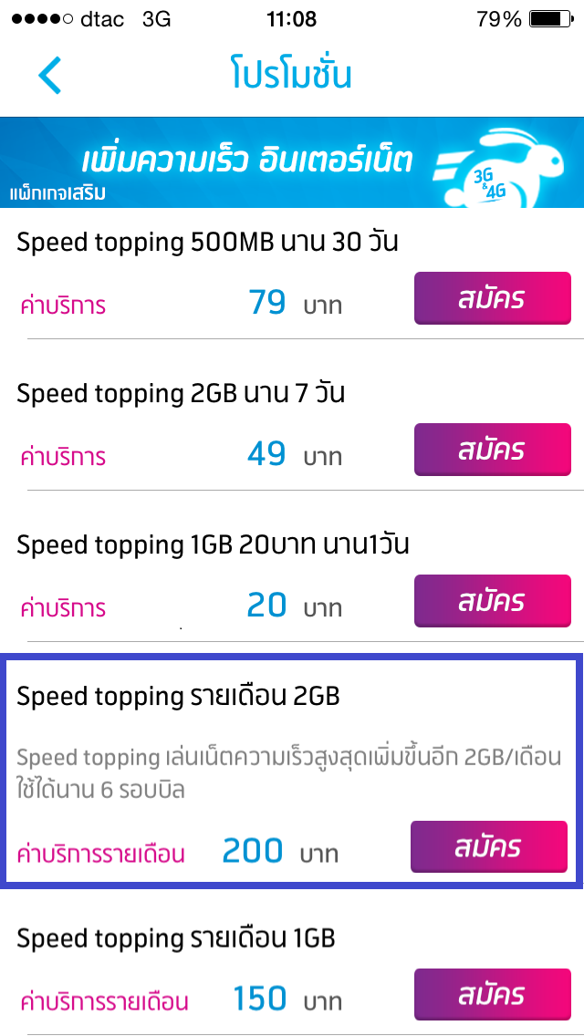 ใช้ระบบของ dtac ครับ ใด้รับ offer "ดักดาน" คือ free topping 2GB 12 เดือน กับ package หลัก 1.5 GB รวมเป็น 3.5 GB ในการใช้งาน 3.5 GB ไม่พอครับ ผมก็เลยซื้อ package เสริมเป๋น speed topping 49B.
