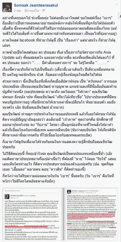 ดร.สมศักดิ์ เจียมธีรสกุล โพสต์แสดงความรู้สึกนับถือแกนนำแดงที่มีชื่อลือลั่นสะท้านปฐพีท่านหนึ่ง