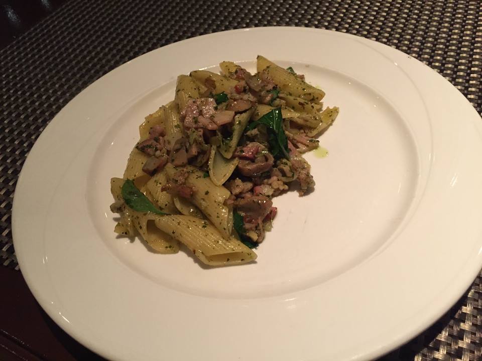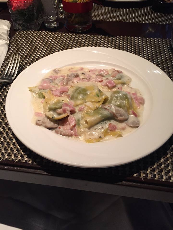 กลุ่มของพาสต้าก็สั่งให้เชฟผัดได้ ซึ่งอันที่หากินยากหน่อยคือ ราวิโอลีคาโบนารา ราวิโอลีถ้าพูดง่ายๆคือพาสต้ายัดไส้ชนิดหนึ่งซึ่งนิยมจะเป็น spinach ซึ่งเป็นผักโขมฝรั่งหรือปวยเล้งนั่นเอง แต่ที่นี่เนื่องจากเชฟนำราวิโอลีไปลวกทิ้งไว้ก่อนแล้วลวกซ้ำ ทำให้ตัวของพาสต้าเละ แต่ที่นี่ใส่แฮมกับเบคอนเยอะมากๆ โดยรวมเลยเค็มไปสักนิด