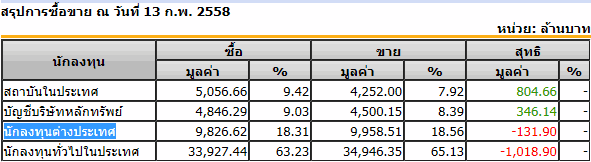 สรุปการซื้อขาย ณ วันที่ 13 ก.พ. 2558