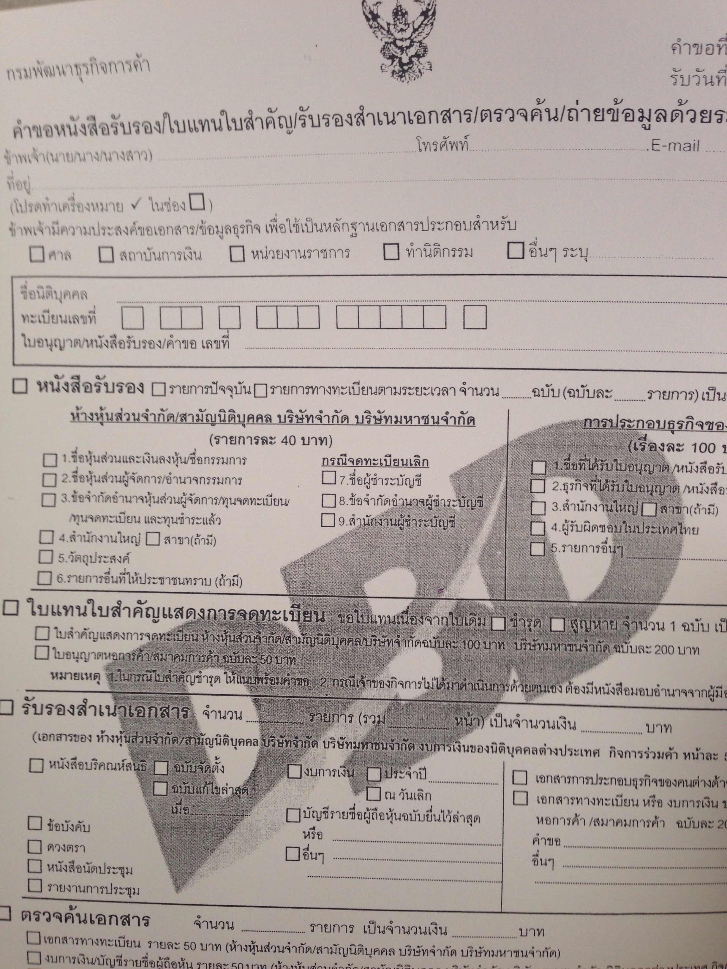 เพื่อนผมเขาให้ผมไปขอหนังสือรายชื่อผู้ถือหุ้นรายใหญ่กับหนังสือบริคณฑ์สนธิที่กรมพัฒนาธุรกิจ แต่ในแบบฟอร์มต้องติกช่องไหนครับขอบคุณมากครับ