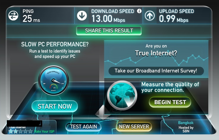 แต่ใช้ความเร็วได้จริง 13 Mbps. ทางทรูแจ้งว่าที่อยู่ตั้งในพื้นที่ความเร็วสูงสุดได้แค่นี้