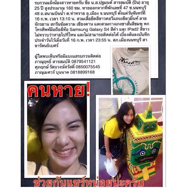 จากภาพ มติชนออนไลน์ ได้รับการร้องเรียน จาก นายทรงกลด ขาวแจ้ง ว่ากำลังติดตามหา นางสาวปฐมนต์ สารสมบัติ (ปิ่น) อายุ 25 ปี สูงประมาณ 160 ซม. ได้หายออกจากที่พักเลขที่ 47 ซ.นนทบุรี 48 ถ.สนามบินน้ำ ต.ท่าทราย อ.เมือง จ.นนทบุรี ตั้งแต่วันจันทร์ที่ 16 ก.พ. เวลา 13.10 น. สวมเสื้อยืดสีขาวคอวีแถบเขียวมิ้นท์ ลายจักรยาน สกรีนข้อความ เชียงคาน และสวมกางเกงขาสั้นสีชมพู พกโทรศัพท์มือถือยี่ห้อ Samsung Galaxy S4 สีดำ และ IPad2 สีขาว ไม่ทราบว่าหายไปที่ไหน และไม่สามารถติดต่อได้ เบื้องต้นลงบันทึกประจำวันไว้เมื่อวันที่ 16 ก.พ. เวลา 23.55 น. สภ.เมืองนนทบุรี สาขารัตนธิเบศร์