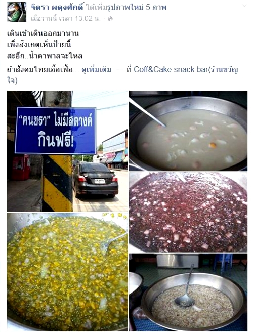โดยลูกค้ารายหนึ่ง ไปพบเห็นร้านขนมไทย ติดป้ายประกาศให้คนชรา ผู้ยากไร้เข้ามารับประทานขนมหวานฟรี ก็ได้นำเรื่องราวมาบอกกล่าว ซึ่งในเฟซบุ้ค จิตรา ผดุงศักดิ์ ได้โพสต์ภาพและข้อความ เมื่อวันที่ 16 กุมภาพันธ์ 2558 ที่ผ่านมาว่า