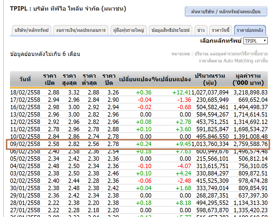 09/02/2558 มูลค่ารวมที่ซื้อขายมากที่สุดคือ tpipl ที่ 2,759,588,000