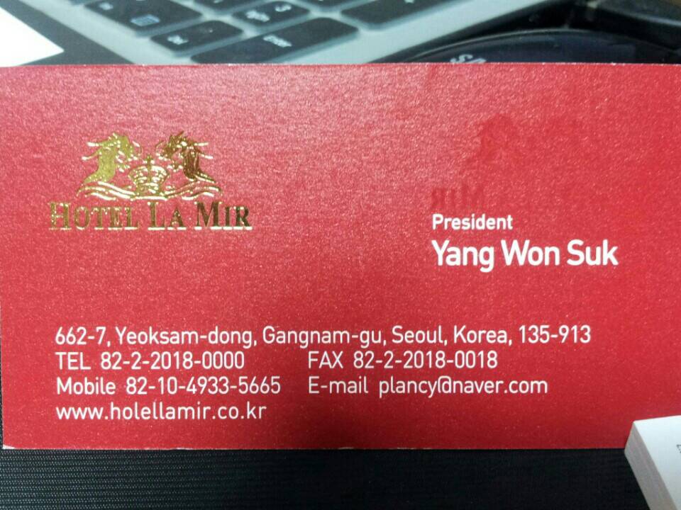 ทีนี้ก็มาถึงการดูเรื่องที่พัก ตอนแรกเราก็ดูจาก Agoda ซึ่งเกสเฮ้าส์ราคาถูกๆก็มีเยอะนะ แต่ส่วนใหญ่ก็โดนจองไปเก็บหมดแล้ว แล้วอีกอย่างเงินสำรองในการจองที่พักเราก็ค่อนข้างมีจำกัด พอดีนึกขึ้นได้ว่าเราเคยทำงานกับเจ้านายเกาหลีนี่นาาาา เราน่าจะขอคำแนะนำเรื่องที่พักได้ก็เลยไลน์ไปปรึกษาจากแฟนของเจ้านายเก่า(แฟนนายเก่าเป็นคนไทย) เจ้านายเก่ากับแฟนที่เป็นคนไทยก็ใจดีมากคะ ติดต่อจองโรงแรมที่เก่าหลีให้(จองเป็นชื่อของนายเก่า)เป็นโรงแรมระดับ 3 ดาว ชื่อโรงแรมเดิม Hotel La Mir ตอนนี้เปลี่ยนเป็น Hotel Pagoda ได้ส่วนลดมา 50% ตกแล้วคืนละ 2,400 บาท (พัก 3 คน) แต่ที่ต้องกังวลก็คือเราไม่มีเอกสารการจองเลย เค้าบอกแค่ว่าไปถึงแล้วให้บอกที่เคาว์เตอร์ได้เลยว่าชื่อ ........ เราก็เลยแอบกังวลว่าถ้าเราไปถึงจะมีปัญหามั้ย มีแค่นามบัตรของเพื่อนเจ้านายแค่นั้น แต่ก็เอาวะลองเสี่ยงดู