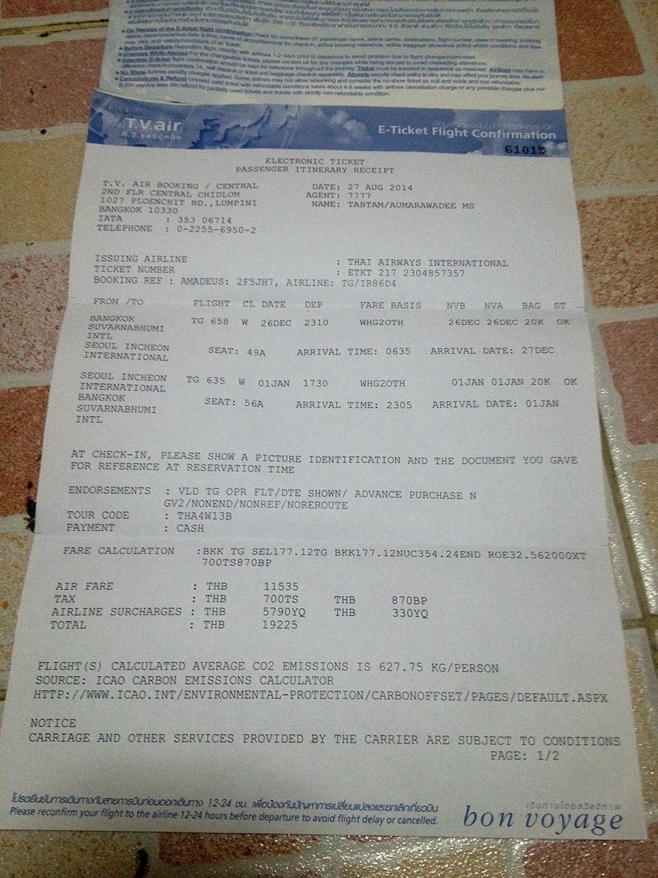 วันที่ 26 ธ.ค. 57 วันนี้เป็นที่ยุ่งเหยิงมาก ตอนบ่ายมีนัดกับแฟนว่าจะไปรับที่ทำงาน (เราหยุดงานแล้วแต่แฟนยังต้องไปทำงาน) ปรากฏว่ารถเสียคร่าาาาาหม้อน้ำระเบิดอยู่บนทางยกระดับ ก็ต้องเคลียเรื่องรถ กว่าจะซ่อมเสร็จก็ปาเข้าไปบ่าย 2 บ่าย 3 ก็เลยไปรับแฟนเลย แฟนดันโดนแก้งานอีก ยัน 6 โมงเย็นถึงได้ออกจากที่ทำงานแฟน รอติดอย่างบ้าคลั้ง จนไม่ไหวและ 2 ทุ่มและ เราต้องทำไรสักอย่าง เลยตัดสินใจลงทางด่วน แล้วหาที่จอดรถ นั่งวินต่อกลับห้อง แล้วค่อยให้คนมาเอารถแล้วกัน ถึงห้องก็อาบน้ำแต่งตัว รีบไปสนามบินสุวรรณภูมิ เช็คอินเสร็จสรรพ