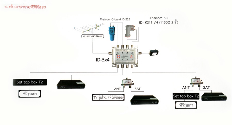 ต้องเปลี่ยน multiswitch เป็นแบบ 5X4 ครับ คือมีช่องสำหรับ ต่อปีกดิจิตอล แล้วตอนขาออกเข้าทีวี ก็ต้องมี spliter เพื่อแยกสัญญาณ จานดาวเทียม กับ เสาอากาศ ตามรูปครับ ที่มา http://www.9sats.com/product/product.detail.php?&cat=75&id=1777