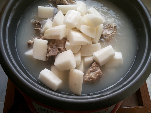 ใส่หัวไชเท้าที่หั่นเตรียมไว้แล้ว ปิดฝา แล้วก็รออีกตามเคย