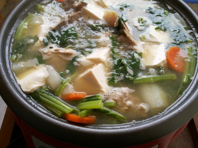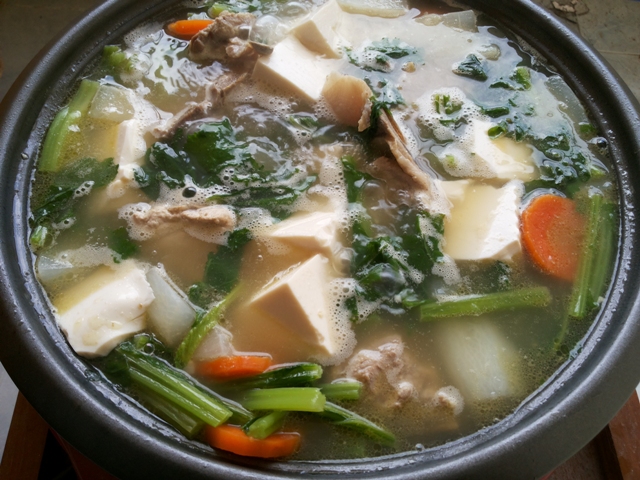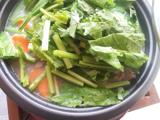 จัดแจงหาหม้อที่สามารถบรรจุผัก/กระดูกหมูใส่น้ำแล้วไม่หก