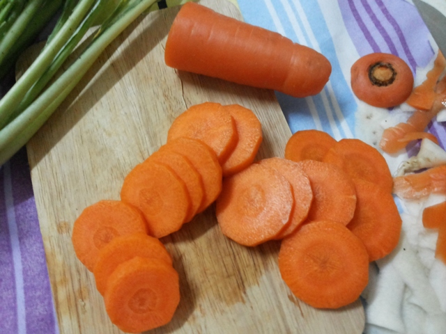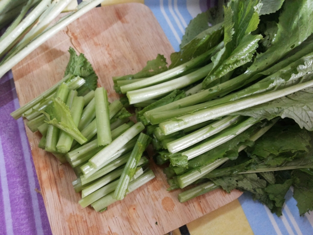 ผ่านไป 5 นาที ไปหั่นผักล้างผักค่ะ ยังเหลือกวางตุ้งอีกหนึ่งกำ หั่นแล้วใส่เลยก็ได้ถ้ามั่นใจในความสะอาด