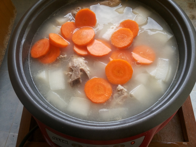 ใส่กระดูกหมูลงไป ปิดฝา รอ รอ รอ ประมาณ 10 นาที น้ำเริ่มเป็นสีขาวขุ่น (ระหว่างนี้ อยู่ว่างๆช้อนฟองออกบ้างก็ดีนะ)
