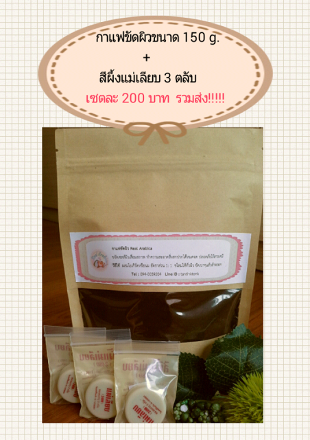 3. เซตกาแฟขัดผิว 150g. ราคา 100฿ + สีผึ้งแม่เลียบ ตลับละ 25฿ จำนวน 3 ตลับ