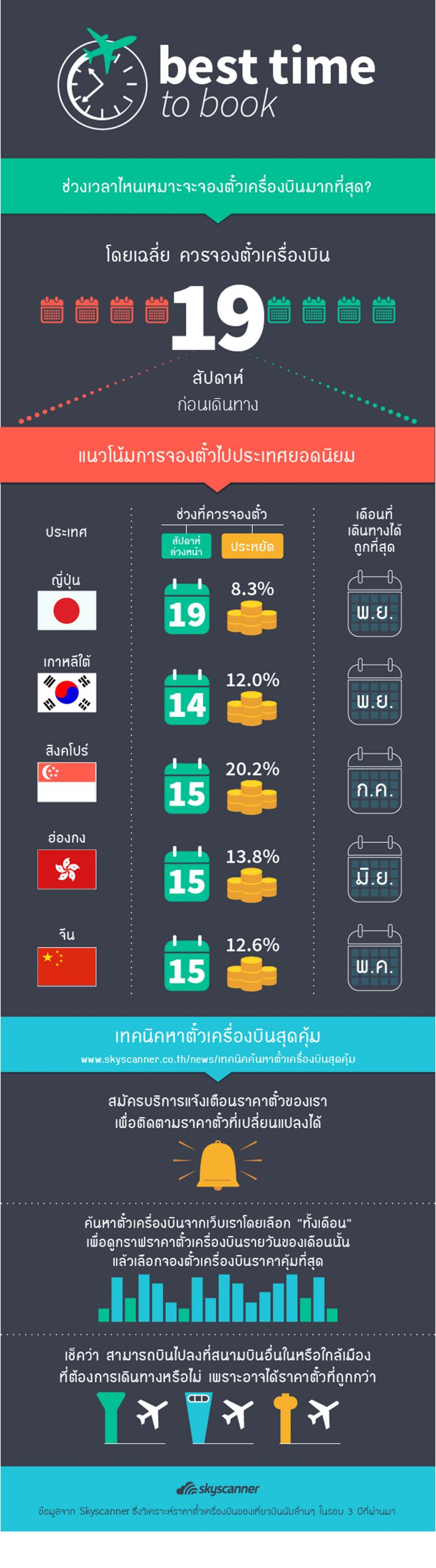 Skyscanner วิเคราะห์พบว่าการจองตั๋ว 19 สัปดาห์ก่อนการเดินทาง คือช่วงเวลาที่ดีที่สุดในการจองตั๋วเครื่องบิน โดยจะสามารถประหยัดราคาค่าตั๋วเครื่องบินได้ประมาณ 8% ของราคาปกติ แต่หากคุณไม่สามารถแพลนการเดินทางได้ไกลขนาดนั้น อย่างน้อยก็ควรแพลนให้ได้ 14 สัปดาห์ก่อนการเดินทาง ก็จะช่วยให้คุณไม่พลาดตั๋วราคาถูกแน่นอน