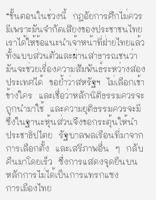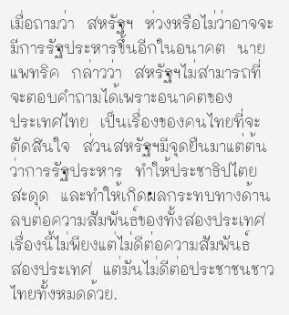 นายดับเบิลยู แพทริค เมอร์ฟี อุปทูตสหรัฐอเมริกา ชี้แจงปัดเข้าข้างใคร แต่จี้ให้เลิกกฎอัยการศึก
